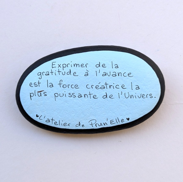 Chaque galet est unique et comporte une citation positive au dos.
