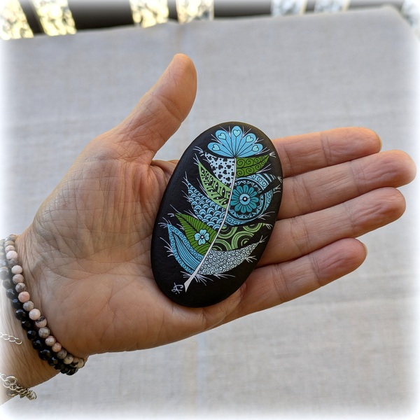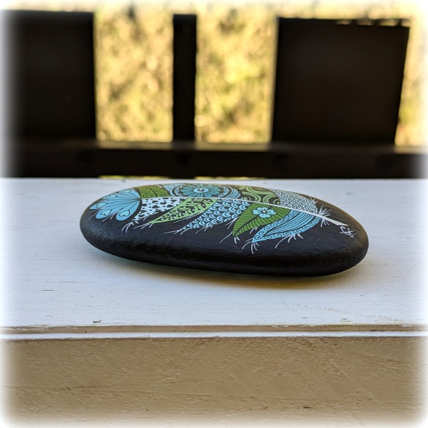 Galet de rivière peint à la main avec des peintures acryliques, protégé par 2 couches de vernis mat.