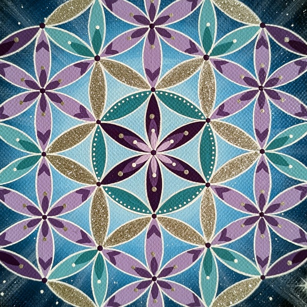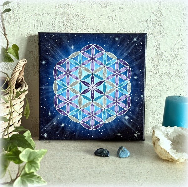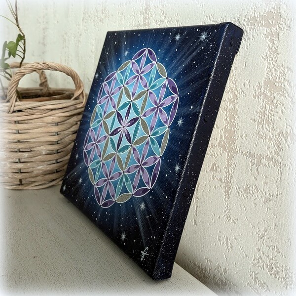 Peinture vibratoire « Intuition », fleur de vie mauve, turquoise et argent sur fond cosmique.